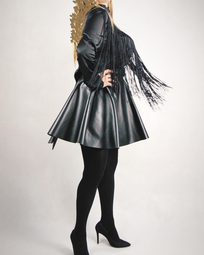 دامن چرم مشکی تیروکمانی کره ای پشت جیر همراهش یک کمربند پشت پاپیون داره با دکمه بسته میشه که به صورت جدا هم میتونید با لباس های دیگه استایل کنید