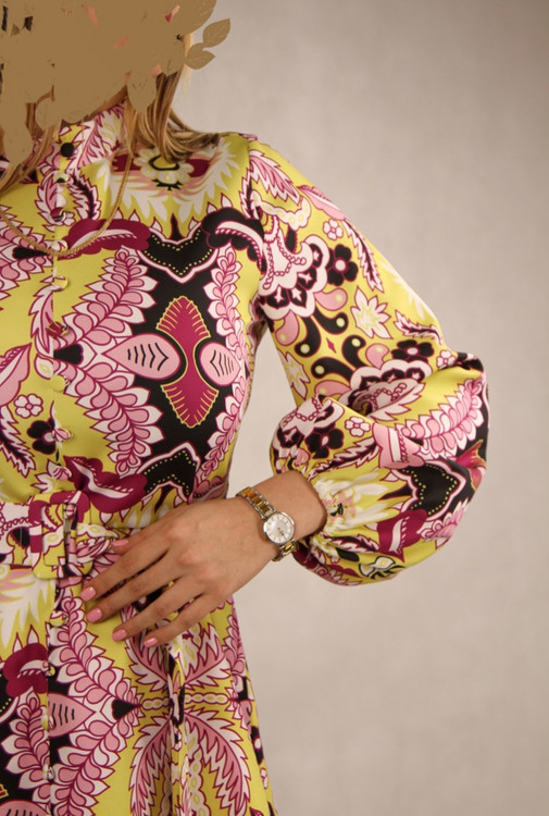 پیراهن طرح گل کرپ کش اورجینال پشت زیپ جلو دکمه نما دو جیب قابل استفاده کمربند دار جذاب آستین چین