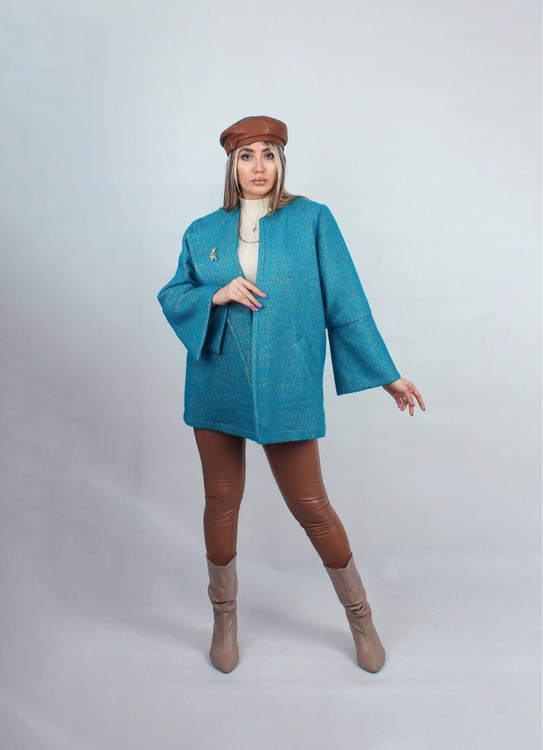 کت یقه برگشته یه طرفه بوکله ملانژ آبی فیروزه ای